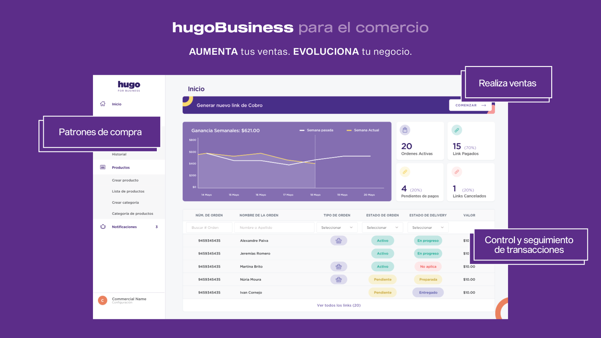 An omnichannel web platform & mobile app that lets users build predetermined and personalized payment links, automatically create an online store from their inventory and deliver their products through Hugo’s logistics network.